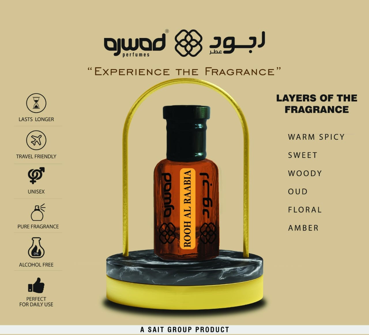 Discover Rooh Al Raabia, an alcohol-free, unisex fragrance that perfectly captures the joy of living. Blending warm, spicy notes with sweet, woody oud and floral amber, this scent offers an alluring aroma that lingers all day long. Travel-friendly and long-lasting, it’s the perfect accompaniment to your daily life!